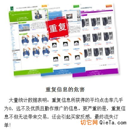 答:發布重復信息并不會給商鋪推廣和交易帶來任何好處,反而會適得其反帶來以下害處: